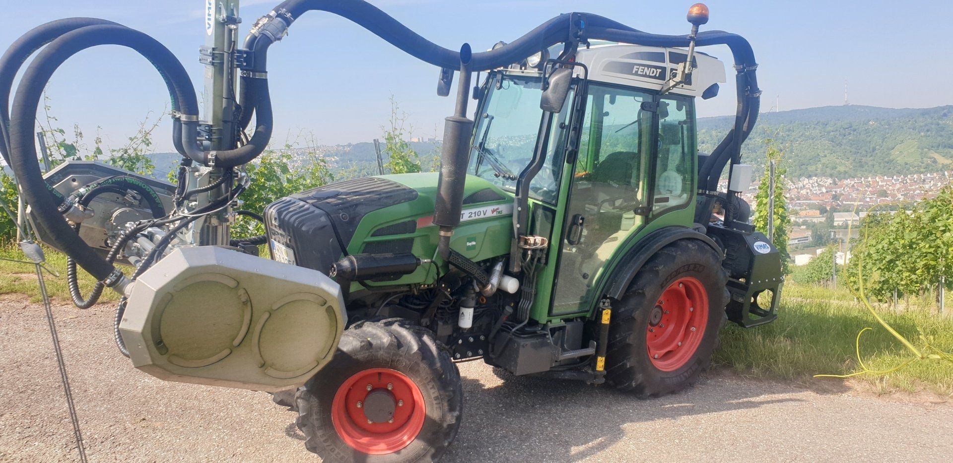 Die Entlaubung wird mittels Druckluftentlauber durchgeführt. Der Entlauber bearbeitet eine Gasse rechts und links. Die Entlaubungsitensität wird über die Fahrgeschwindigkeit und den Druck eingestellt. Es kann je nach Entlaubungsgrad zwischen 2,5-5 km/h gefahren werden. Das speziell von uns entwickelte Gerät kann mit sehr geringem Druck arbeiten, das der Schnung der Beeren sehr zu gute kommt.
