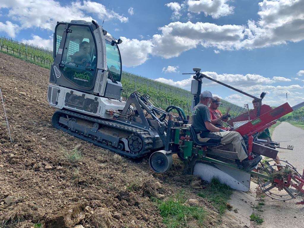 Das Rebenpflanzen wird mit einer Steillagenpflanzmaschine (Eigenumbau) an einer Steillagenraupe mit Seilwinde durchgeführt. Der Winzer muss lediglich die Grenzsteine markieren, damit im Winter das Feld vermessen und eingeteilt werden kann. So kann die genaue Anzahl der Reben ermittelt werden.