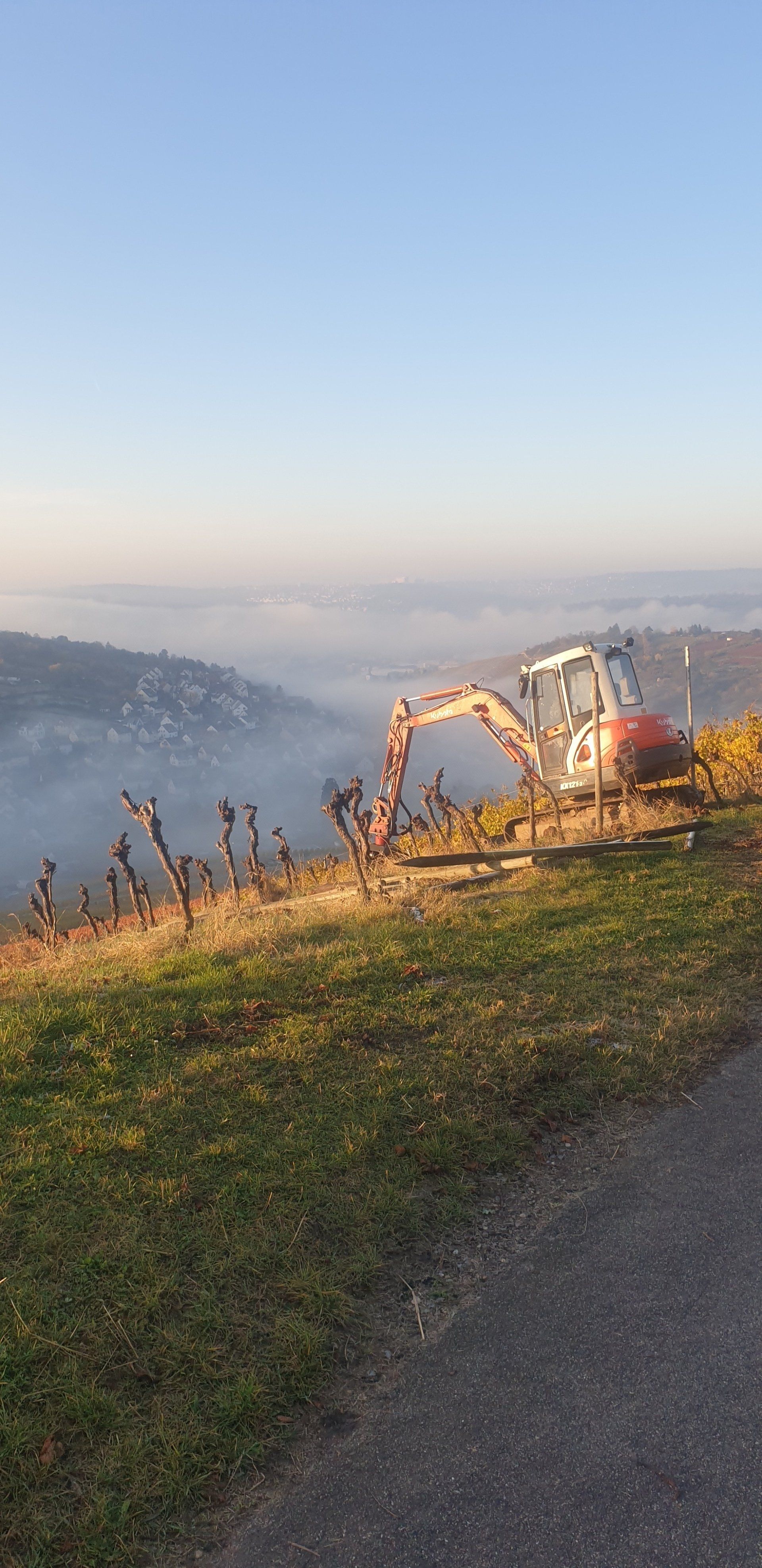 Wir roden mit einem 4 t. Bagger mit angebautem Universalgreifer. Es ist auch in steilen Direketzuganlagen möglich. Eine Bodenverdichtung vermeiden wir durch breite Ketten und ausgereifter Rodetechnik.