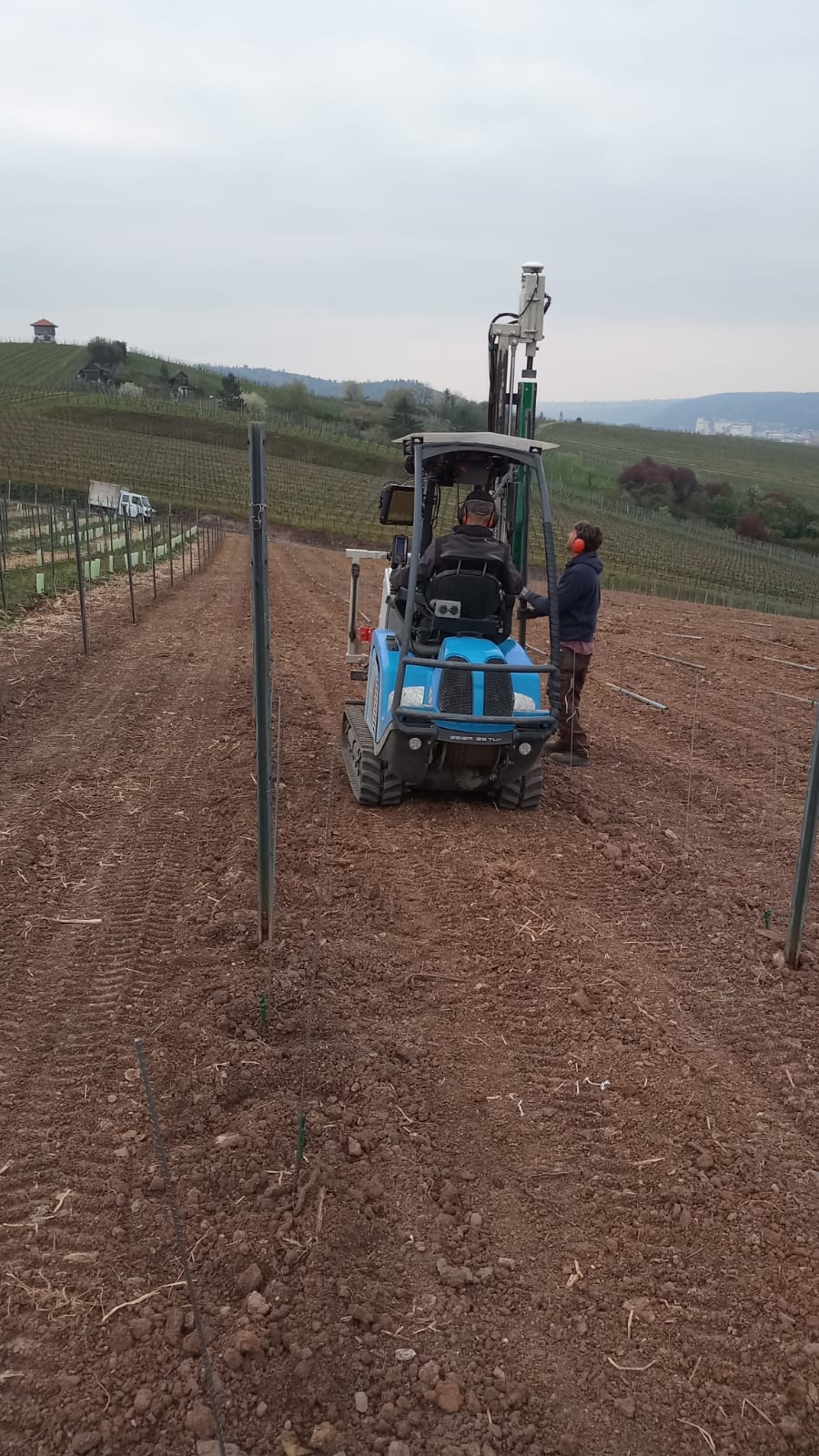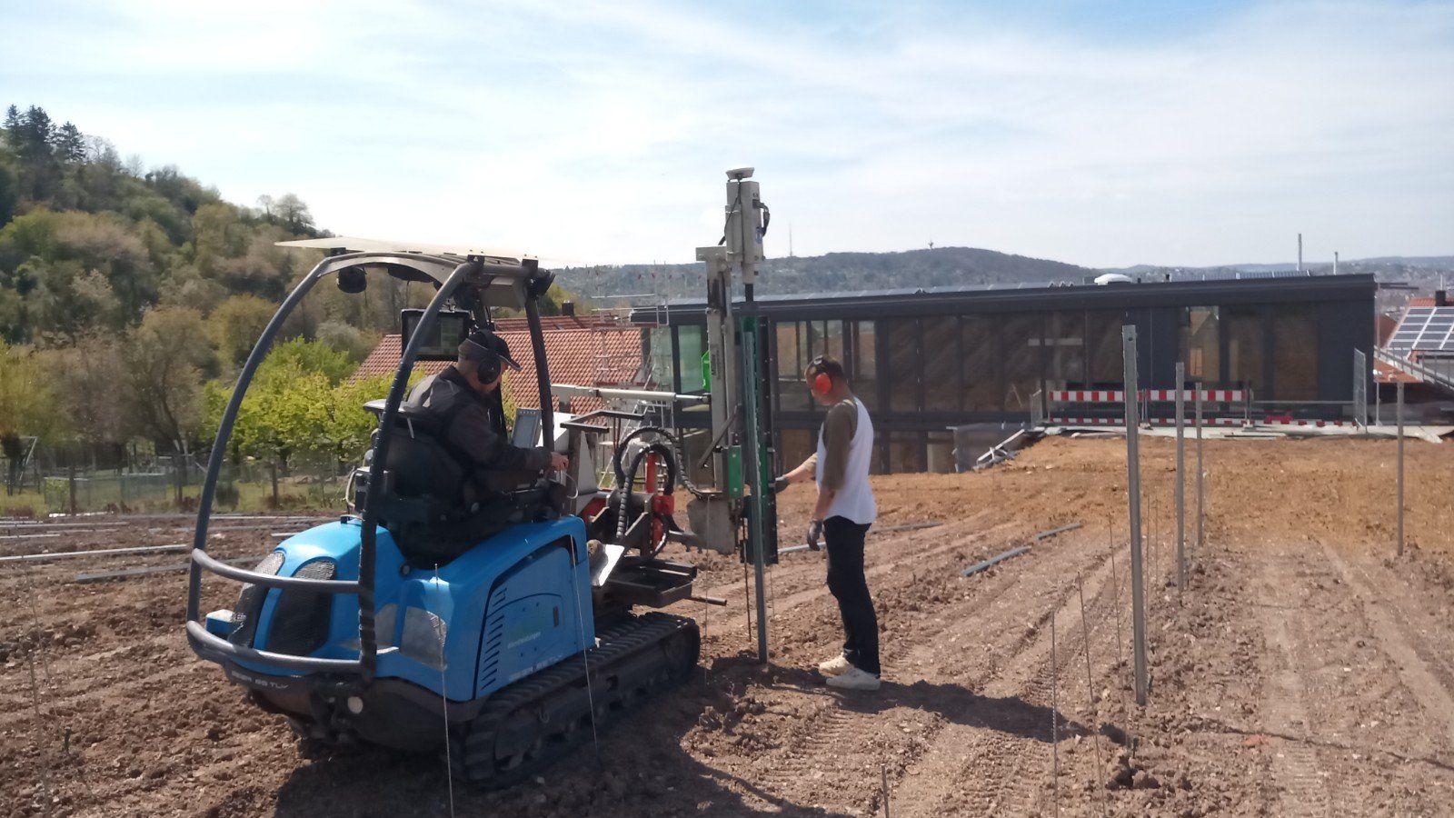 Das Stickel eindrücken wird mit einer Geier Raupe durchgeführt. Mittels eines selbst entwickelten GPS Stickeldrücker werden die Stickel in X und Y Richtung ausgerichtet, anschliesend auf die geplante GPS Koordinate positioniert und in den Boden geschlagen.